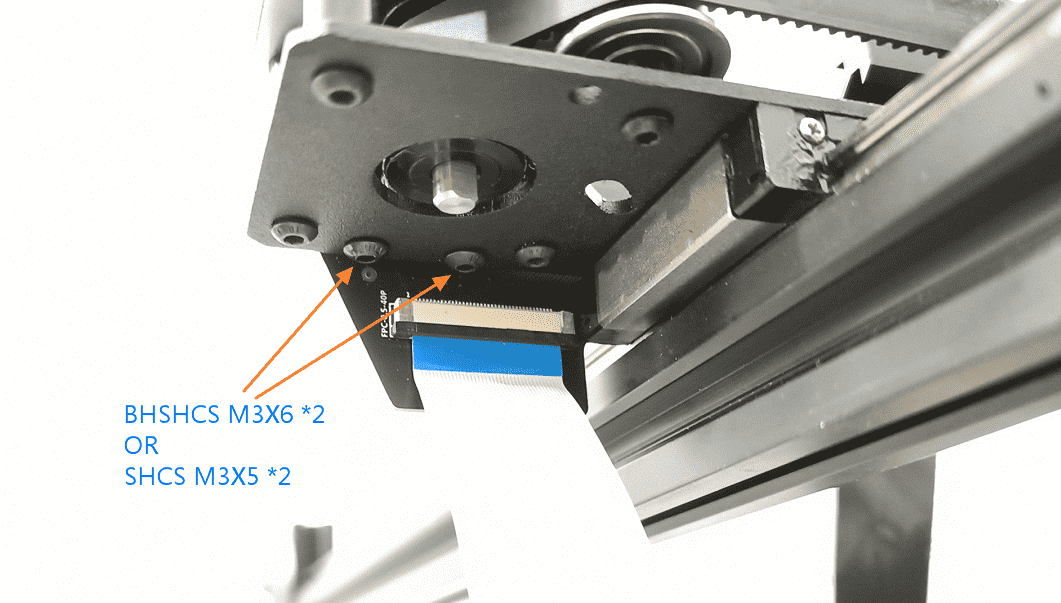 Use BHSHCS M3X6 or SHCS M3X5 screws to mount the PP_YCarriageBoard_A_V1.0 board to the left Y slider assembly. Be careful not to damage the FFC connector when installing the screws.