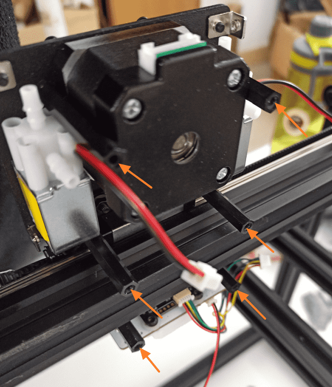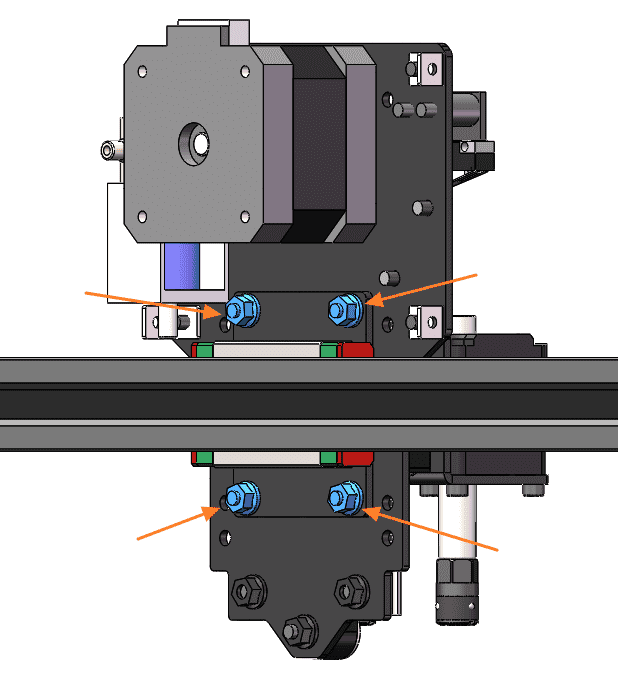 The nozzle stepper assemblies will interfere with the operation, please move the steppers to one end of the rail and install two screws first, then move the steppers to the other end and install the other two screws.