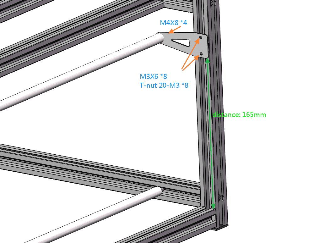 The spool holder consists of 4 Spool Holder Tube and 4 PP-SpoolHolderTubeMount-PCB with pre-machined holes and fixed by screws and t-nuts.