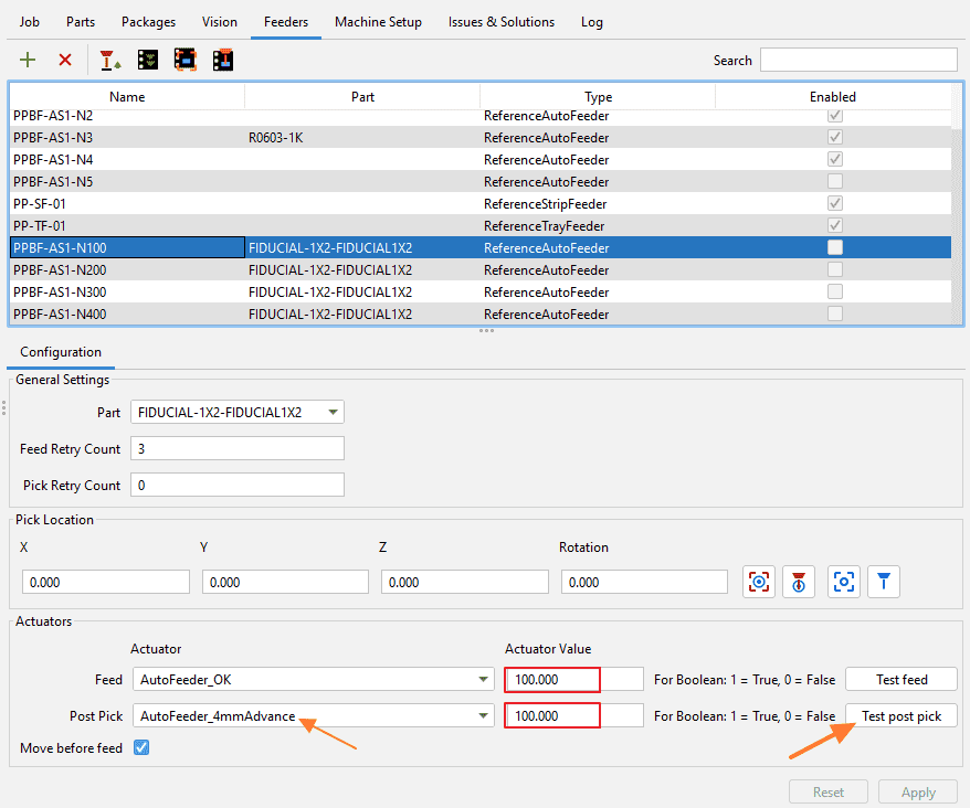 Click on the Test post pick button, if the servo/ AS1 feeder completes the corresponding movement, then the feeder system is operating properly.
