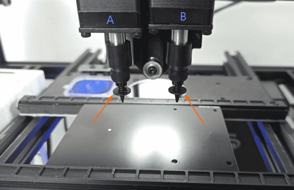 After the machine has been homed, use the manual control panel to move both nozzles above the center area of the PCB.