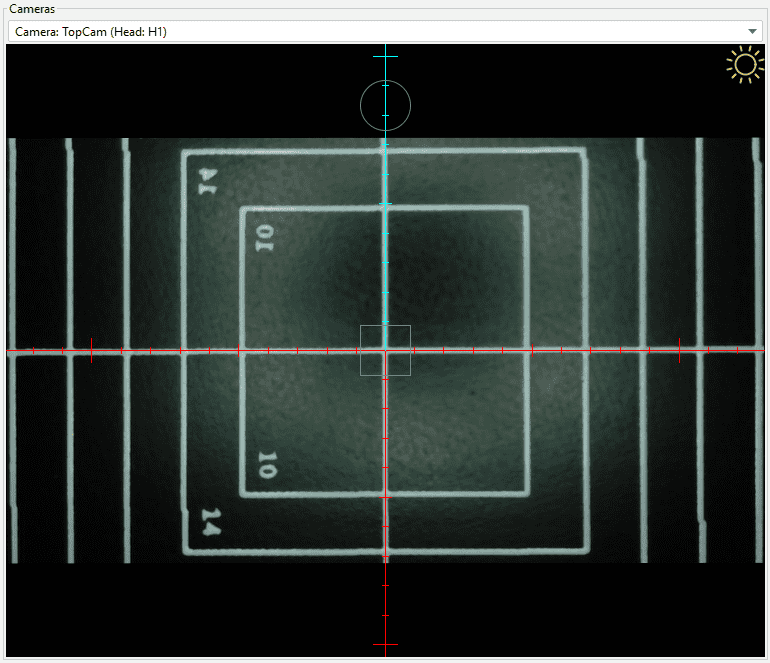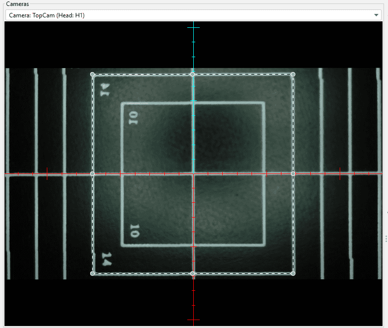 Using the buttons on the Jog tab to move the top camera over the center of the 2nd_Calib board, fine-tune the position so that the crosshairs of the TopCam view are roughly aligned with the crosshairs of the 2nd_Calib board.