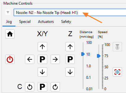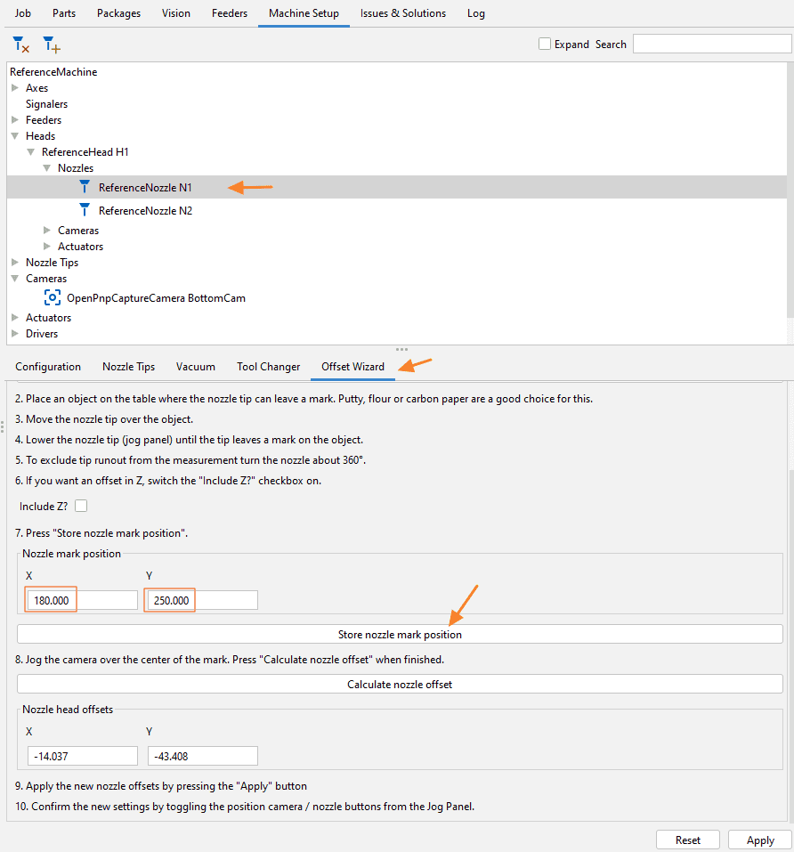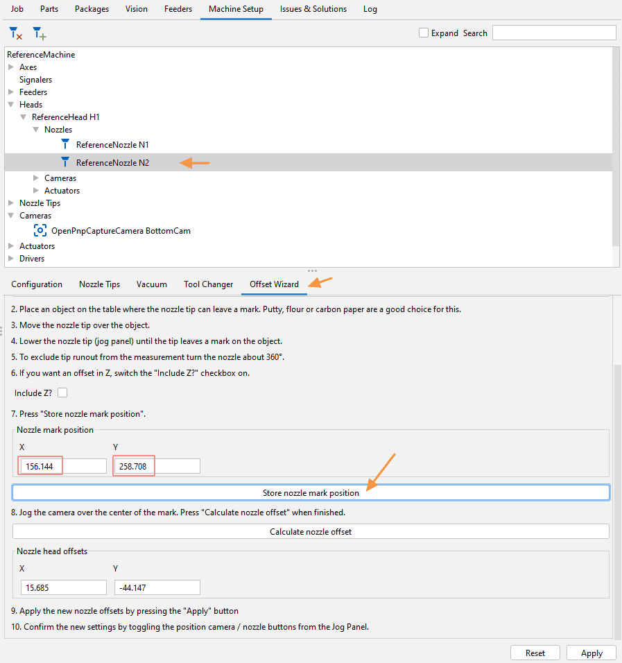 In the Offset Wizard tab of N2 settings , click on the Store nozzle mark position button and the nozzle tip position will be updated in the X Y values.