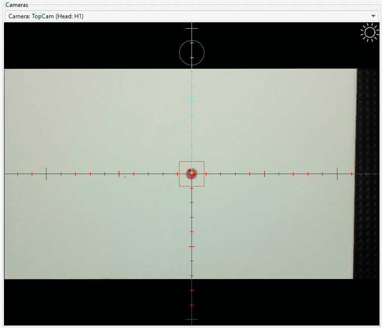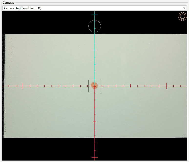 In the TopCam view window, hold down the left mouse button and drag-drop can move the head as well. Finally, adjust precisely by Jog panel so that the center of crosshair in the TopCam view is aligned with the center of the mark point.